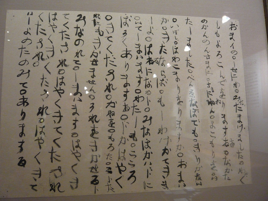 手紙の本文を普通の形に書き直してみます。なお、語句の注釈は、福島県立図書館の「図書館だより」第148号(2004年・平成16年・8月6日号)を参照させていただきました。 お前の出世には、皆たまげました。わたくしも喜んでをりまする。中田の観音様に、毎年(まいねん)、夜籠(よこも)りをいたしました。勉強なんぼでも切りがない。烏帽子(近所の地名。ここは、烏帽子という村からのお金の催促のこと)には困りをりますが、お前が来たならば、申し訳ができましょう。春になると、みな北海道に行つてしまひます。わたしも、心細くありまする。どうか早く来てくだされ。金を貰うたこと、誰にも聞かせません。それを聞かせると、みな飲まれてしまひます。早く来てくだされ。早く来てくだされ。早く来てくだされ。早く来てくだされ。一生の頼みでありまする。西さ向いては拝み、東さ向いては拝みしてをります。北さ向いては拝みをります。南さ向いては拝んでをりまする。一日(ついたち)には、塩断ちをしてをります。栄昌様(隣家の鵜浦栄昌。天台宗の修験者)に一日(ついたち)には拝んでもろてをりまする。なにを忘れても、これ忘れません。写真を見ると、戴いてをりまする。早く来てくだされ。いつ来ると教へてくだされ。これの返事待ちてをりまする。寝ても眠られません。 |